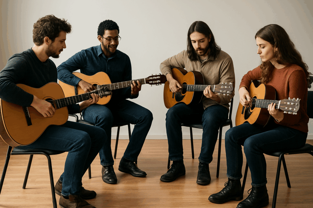 Nos stages et ateliers de guitare sont pensés pour les vrais débutants et pour ceux qui veulent retrouver le plaisir de jouer en groupe (*).